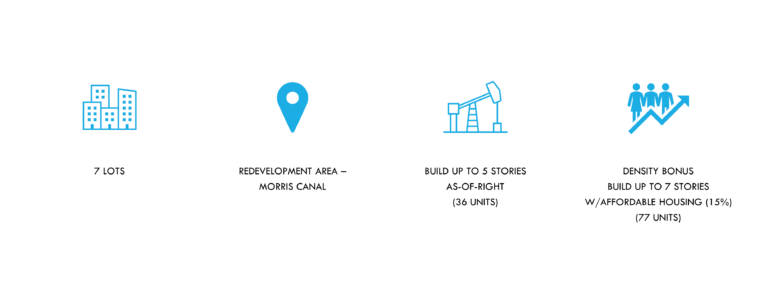 Seven lots comprised of several mixed-use buildings. Located in the Morris Canal Redevelopment Plan. Build up to 5 stories as of right, and 7 stories with 15% affordable housing component. Generate money now and build a multi-family down the line while you wait for approvals. Numerous uses permitted.